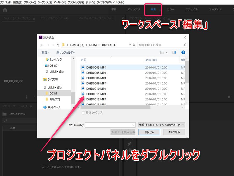 PremiereProを起動したら、ワークスペースの「編集」を選択して、プロジェクトパネルをダブルクリックします。