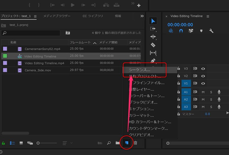 またはショートカット、Ctrl+Nキーで新規シーケンスを作成することもできます。