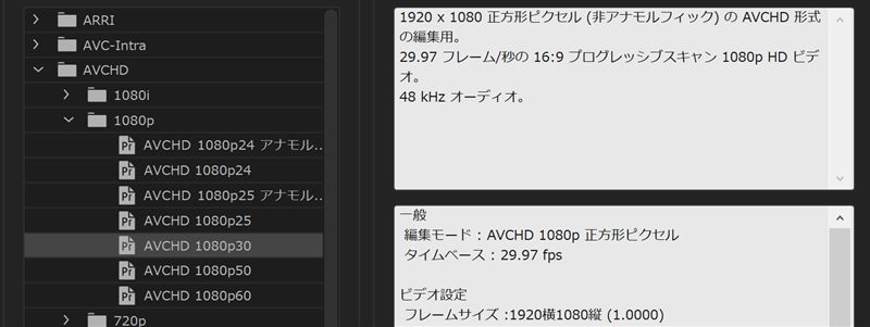 一眼カメラで動画撮影をする方は、シーケンスプリセット「AVCHD」や「DSLR」のを使うのがオススメです