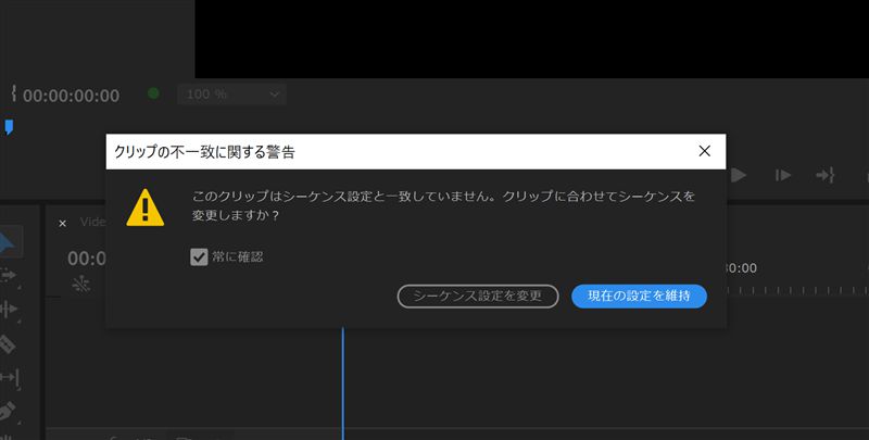 シーケンスに解像度の設定が違うクリップを乗せようとすると、シーケンスの設定を維持するか?変更するか聞かれます。
